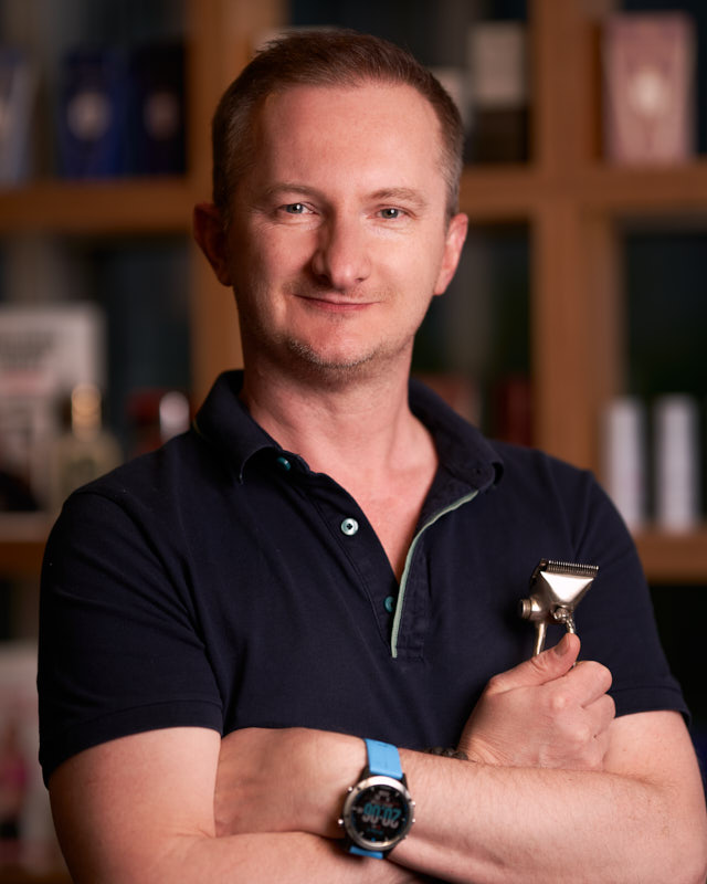 Jako jeden z nielicznych fryzjerów kontynuuje tradycję golenia brzytwą. Certyfikowany golibroda marki Truefitt&Hill, ukończył szkolenie w najstarszym salonie fryzjerskim w Londynie.